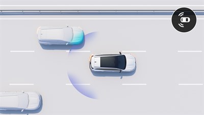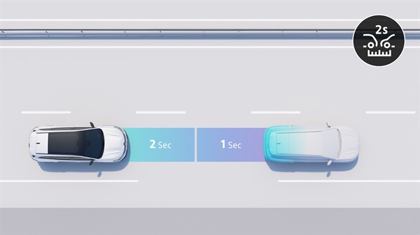 Grâce au capteur radar, le système calcule la distance séparant Renault Espace full hybrid E-Tech du véhicule qui le précède et alerte le conducteur s’il y a un risque de collision notamment avec des usagers vulnérables. Le conducteur peut alors freiner, mais si le système détecte toujours un risque de collision, la force de freinage est augmentée. Si le conducteur ne réagit pas, le système active automatiquement les freins.
